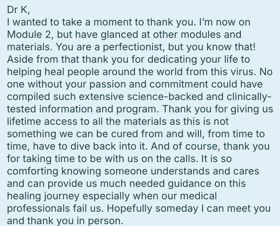 "The BEST program and best coach out there! ❤️ Thank you Dr. Kasia Kines ❤️ for having this program and for giving me my life back. It's a very different one from the before EBV but it is now sooooo much better thanks to your passion and your mission to help us with EBV heal and navigate through the darkness.” - Kate